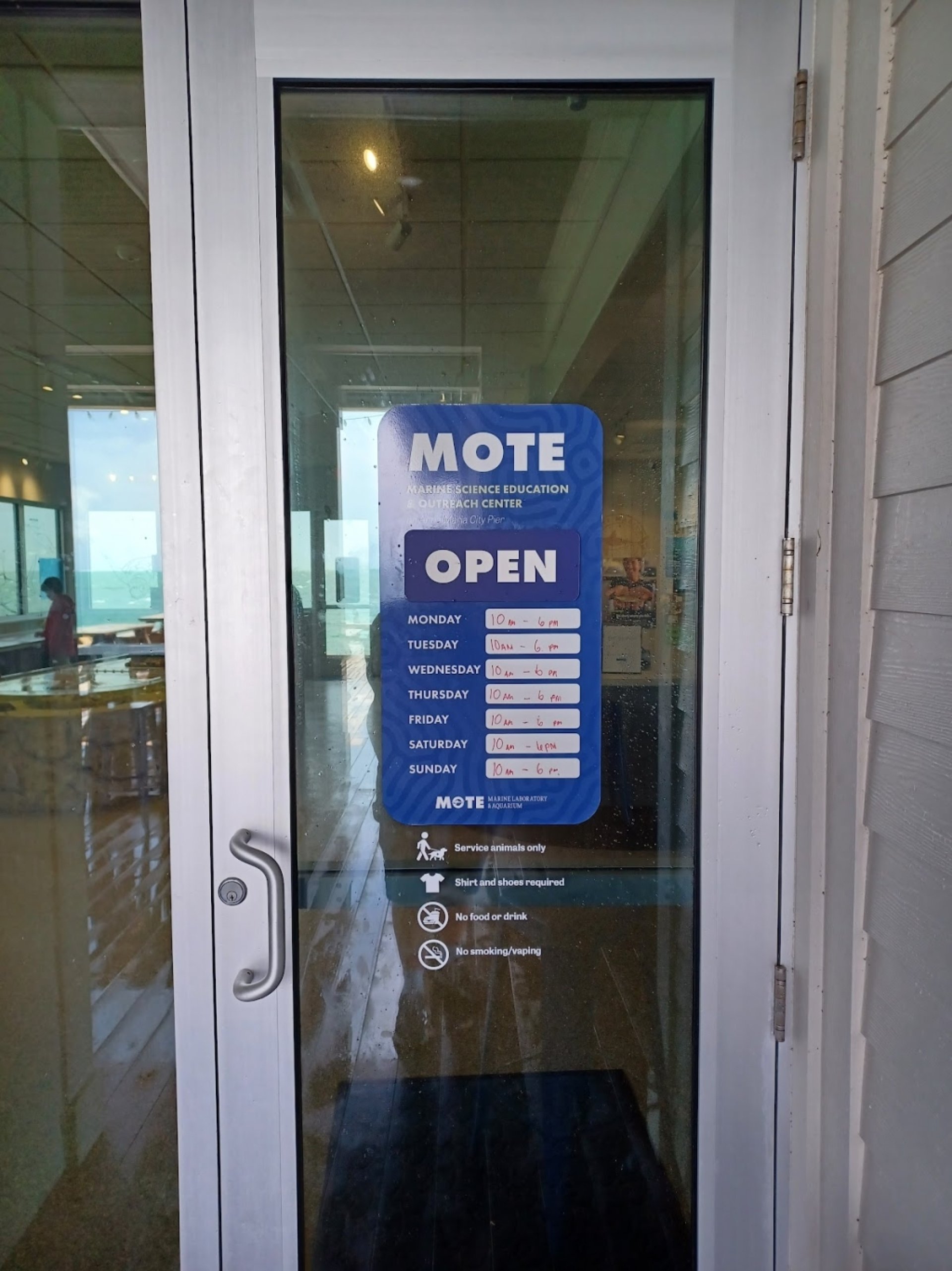 Fantastic experience: Very cute place to bring young kids for a little marine science education at the end of the pier. There are touch tanks and small aquariums and things to touch. I definitely plan to bring my kids to the Mote Marine facility while on this vacation. The best part is this little area is free.