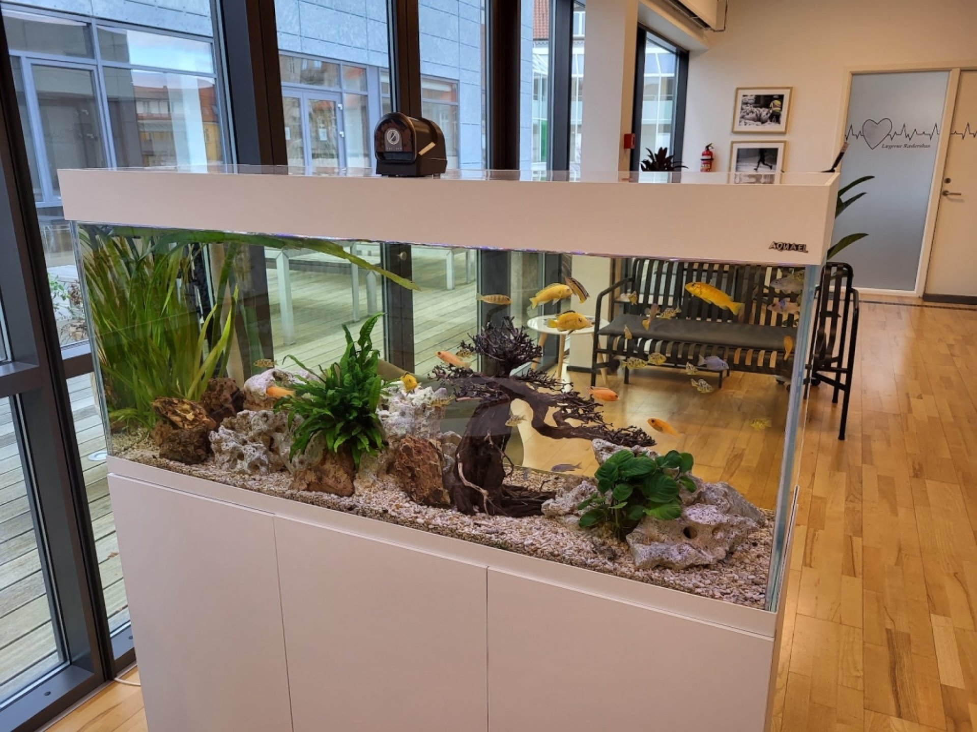 Køber man et akvarium ved Akvo Akvariepleje og tegner en serviceaftale, så er man i gode hænder. Akvariet vil altid fremstå flot, til glæde for såvel gæster, kunder, medarbejdere, elever, beboere osv. Det har en god signalværdi og fortæller blandt andet at man værdsætter sine medarbejder, beboere med mere. Akvariet er foranderligt, som et levende maleri og kan til enhver tid ændres til et andet tema.