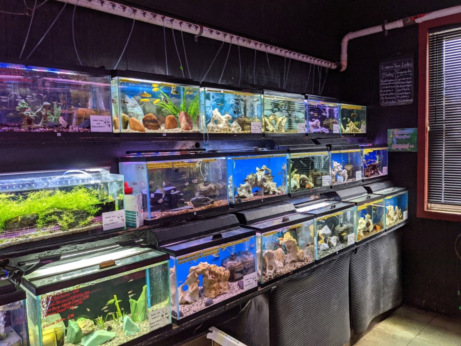 Experiencia fantástica: Excellent aquarium fish store! Has a very good selection of tropical fish and aquatic plants as well as pretty much everything else one might need for this hobby: tanks, filters, fish food etc. As far as I can tell, they also have a big variety of saltwater fish and corals, but I'm not into saltwater, so take this with a grain of salt. Tanks are clean and fish are healthy. Lots of sales guys ready to help. Overall, this is easily the best aquarium fish store in the NYC area. Beware: quality comes with a price - this is definitely not a cheap place (not ridiculously overpriced either). In the end of the day, fish bought from this store tend to live a long life and this is what matters.