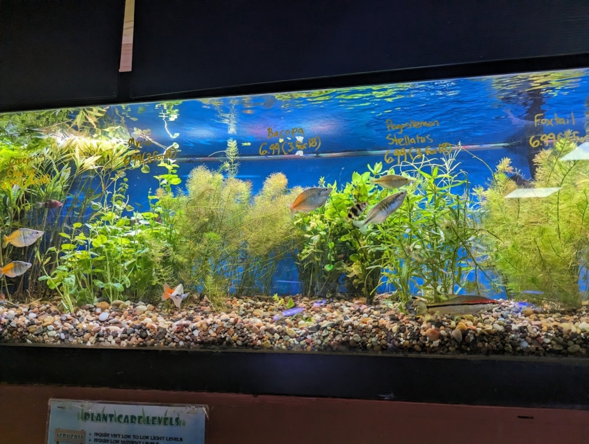 Experiencia fantástica: This store has to be one of the most well kept for its size. They have a huge salt and freshwater selections from fish to coral and plants. They have excellent prices on plants but are very pricey on reefs and saltwater compared to other local stores. It does make sense having prices this high because they have such a huge store and excellent customer service. They probably had at least 10 people out on the floor helping customers. Will definitely come back for any freshwater and plant needs highly recommended.