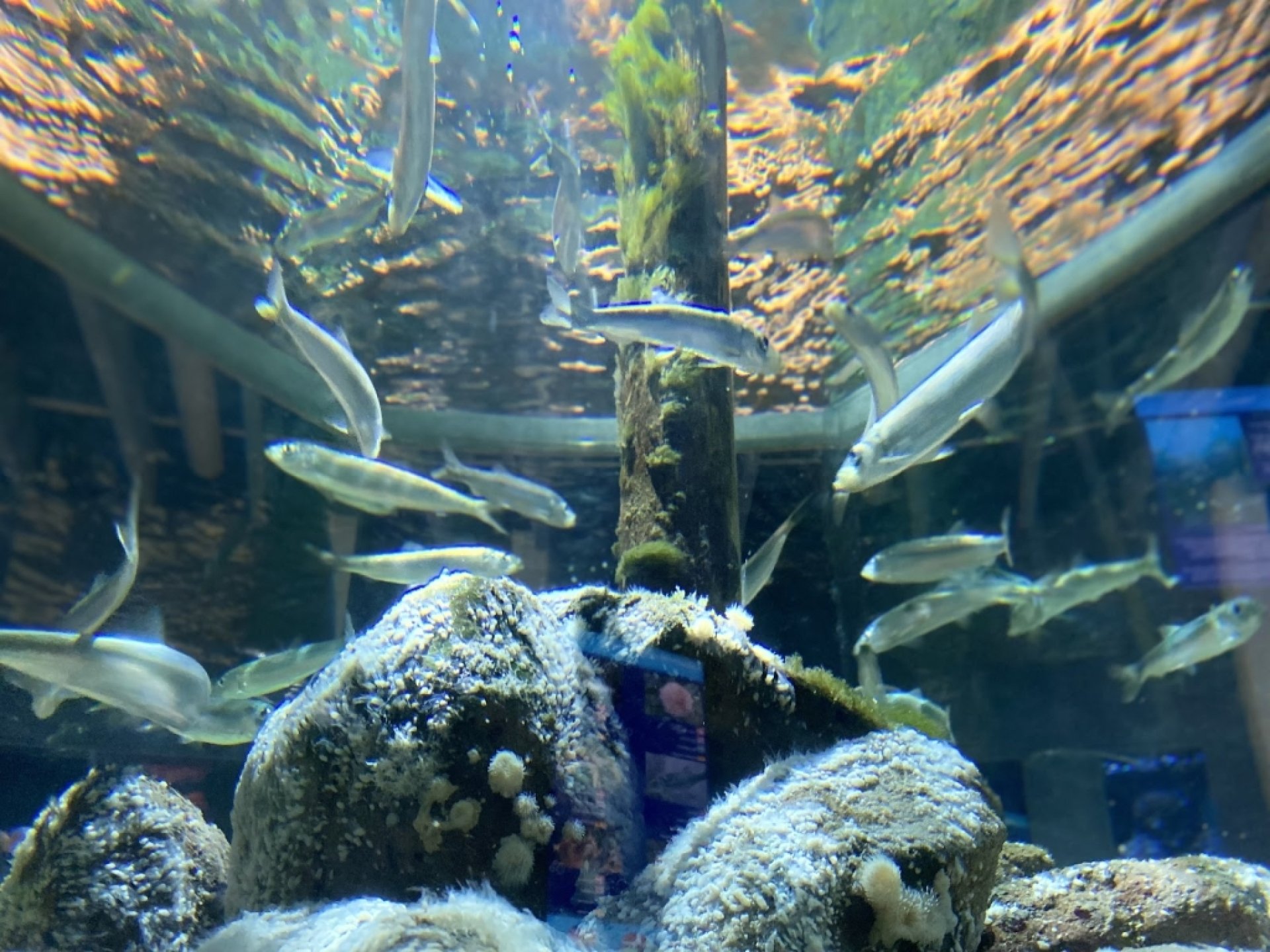 Experiencia positiva: Väldigt litet akvarium, men fint. Med två delar där man kan ”klappa” fiskarna. Tveksamt med tanke på alla små barn som inte kan hantera det.
