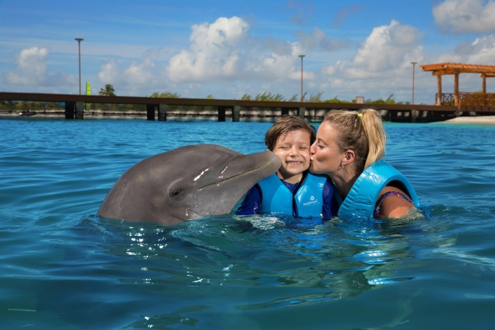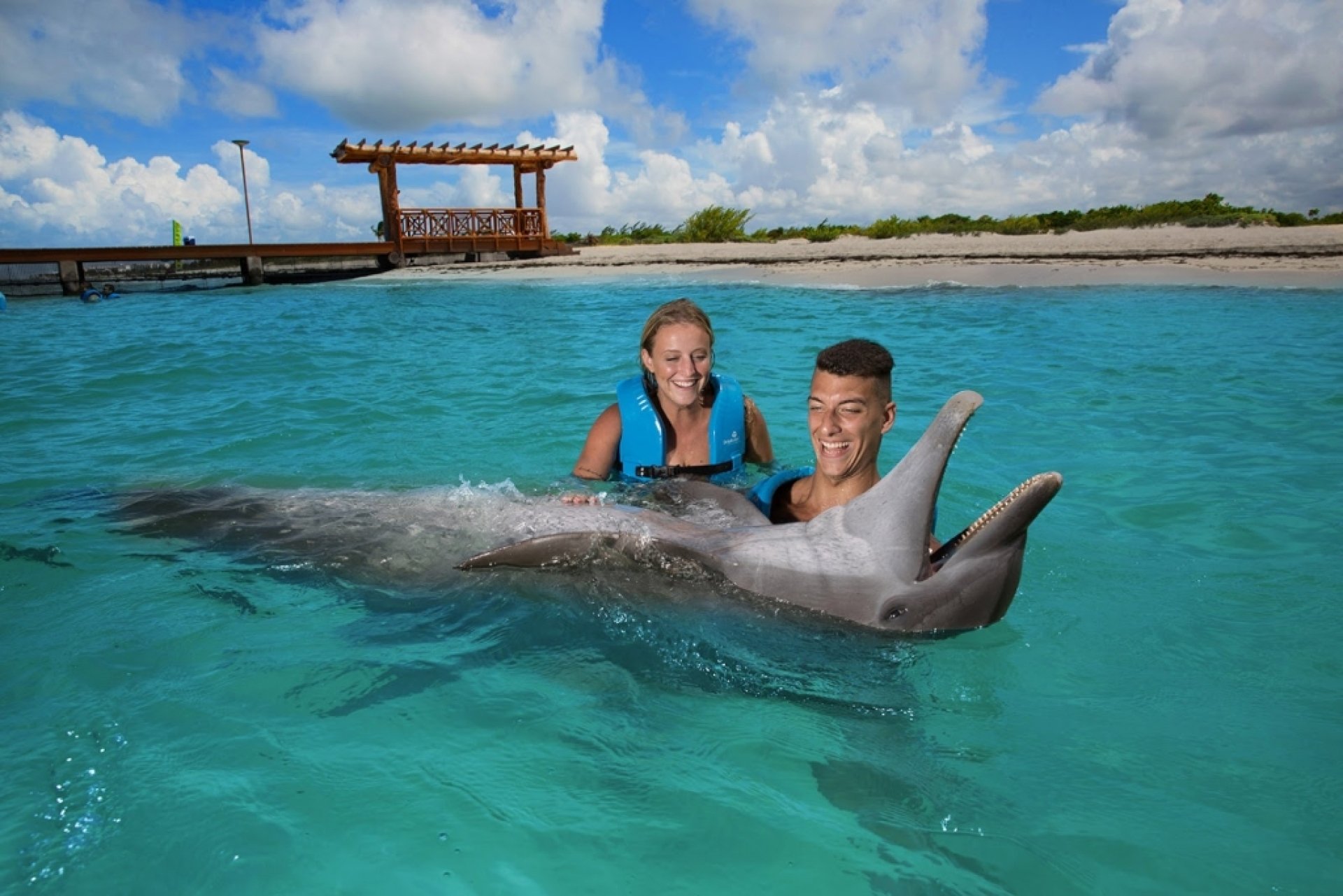 Swim with dolphins in Playa Mujeres, inside Dreams Playa Mujeres Golf & Spa Resort. Enjoy a unique encounter in our natural sea habitat, part of the Riviera Maya. Swim alongside dolphins, hug them, and learn about their intelligence. Discover what to do in Playa Mujeres and enjoy this unforgettable experience.